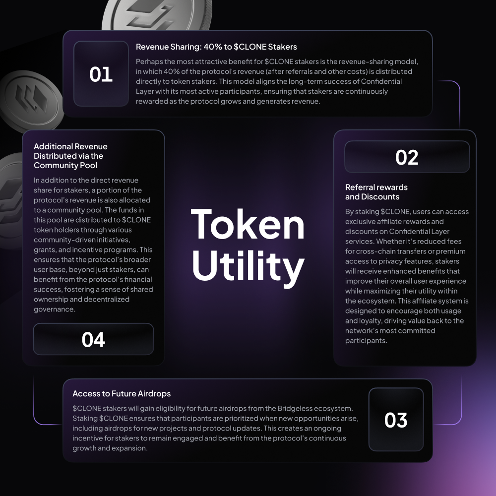 $CLONE token holders within the Confidential Layer ecosystem are not only key stakeholders but also significant beneficiaries of the protocol’s ongoing success. By staking $CLONE, participants unlock a range of utility benefits that offer both short-term rewards and long-term value.