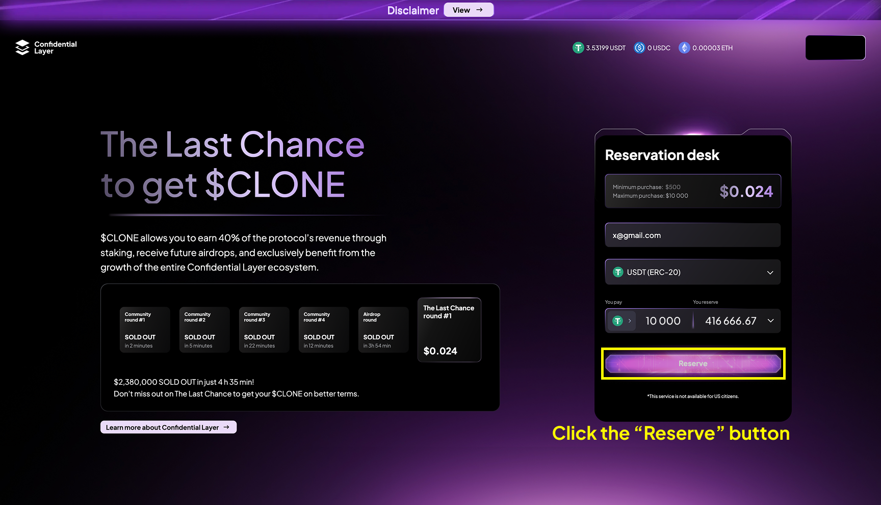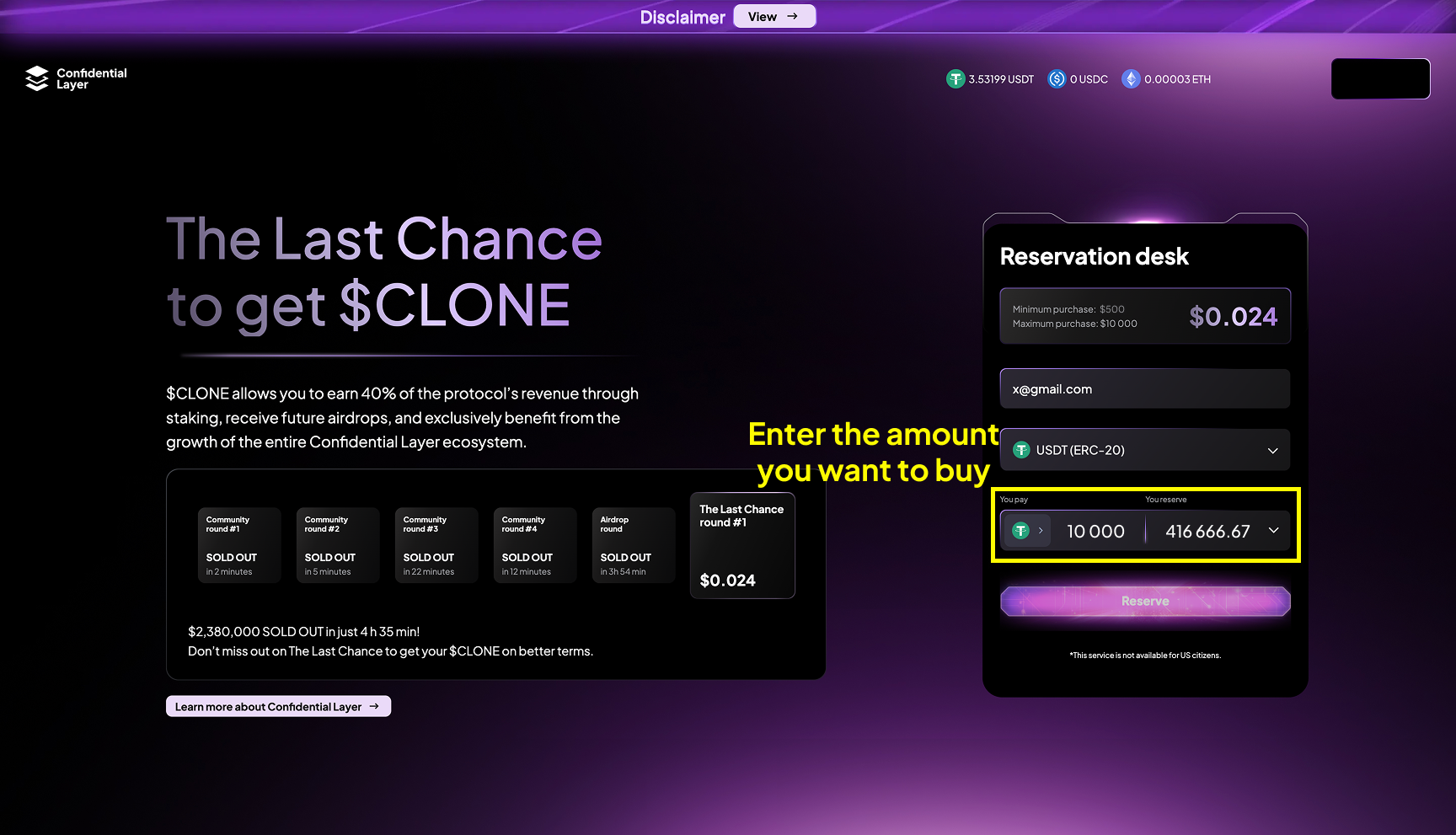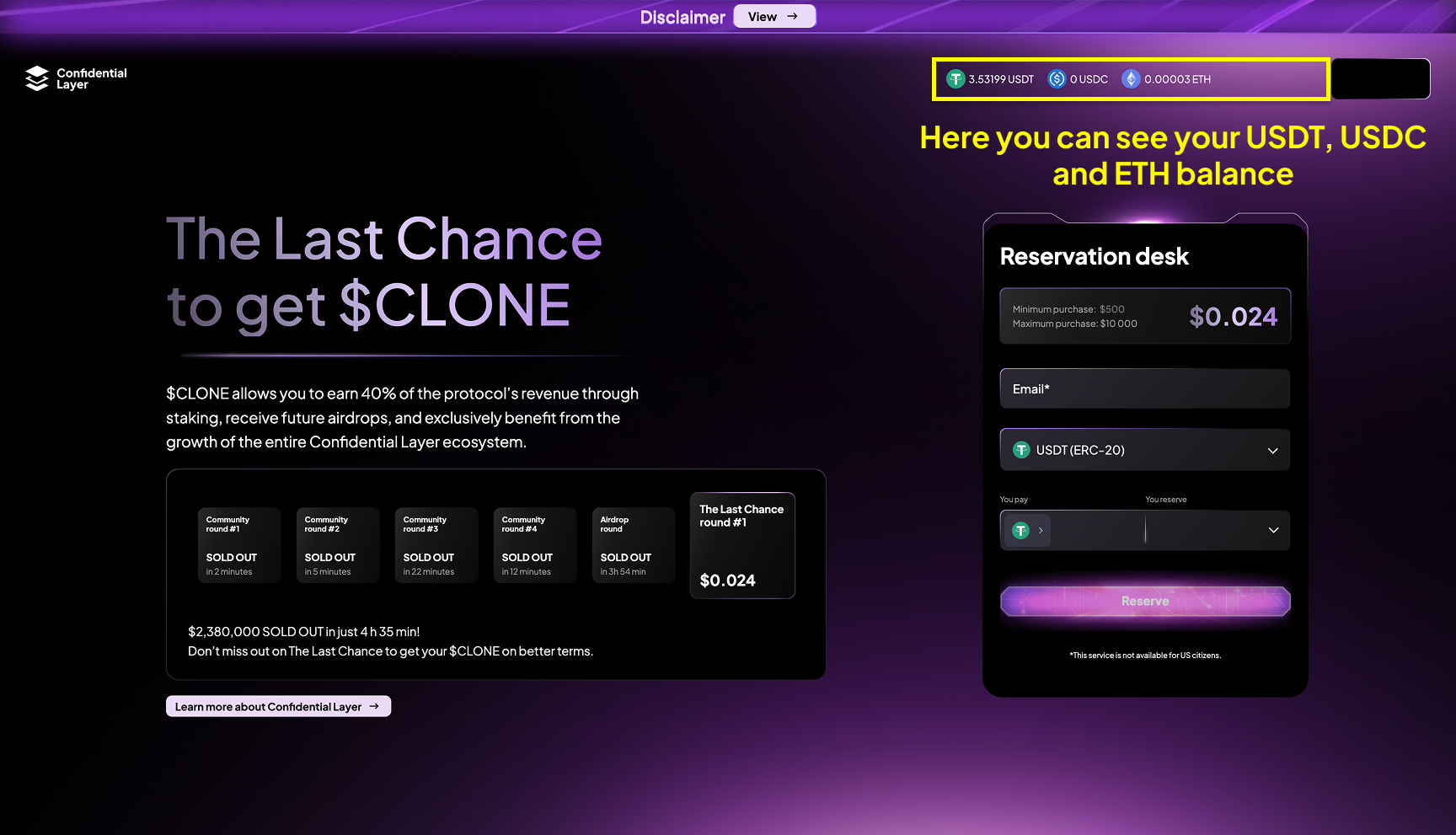 To buy/reserve CLONE, you need to have USDC or USDT on Ethereum chain and ETH for gas on your wallet.