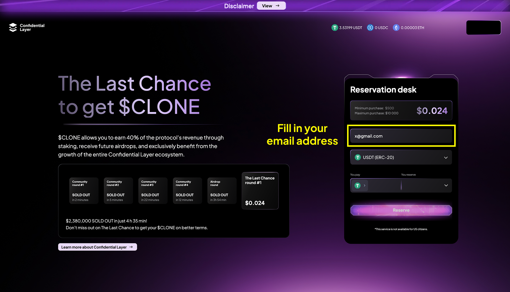 In the official confirmation email, you will see your wallet address as well as your reserved $CLONE amount. We won't ask you to make any additional transactions, nor will we share any links with you!