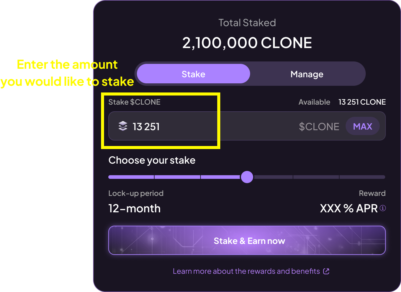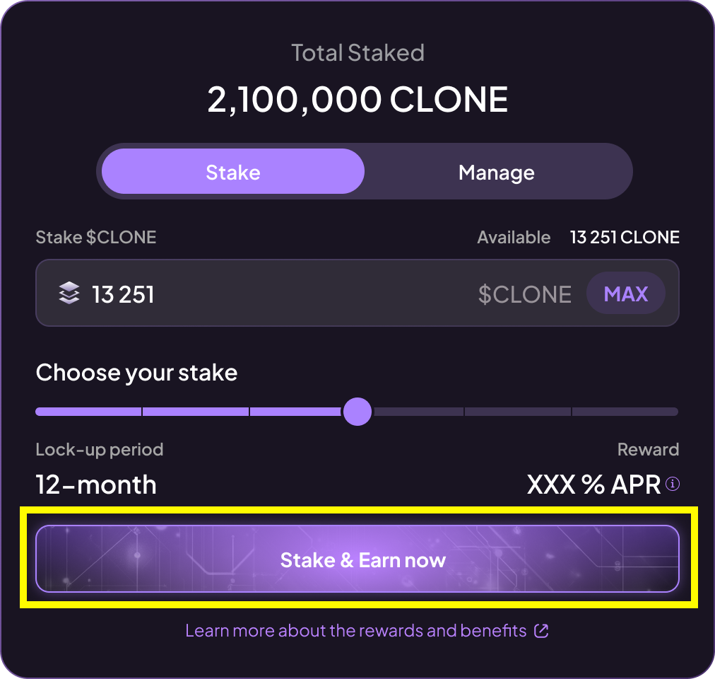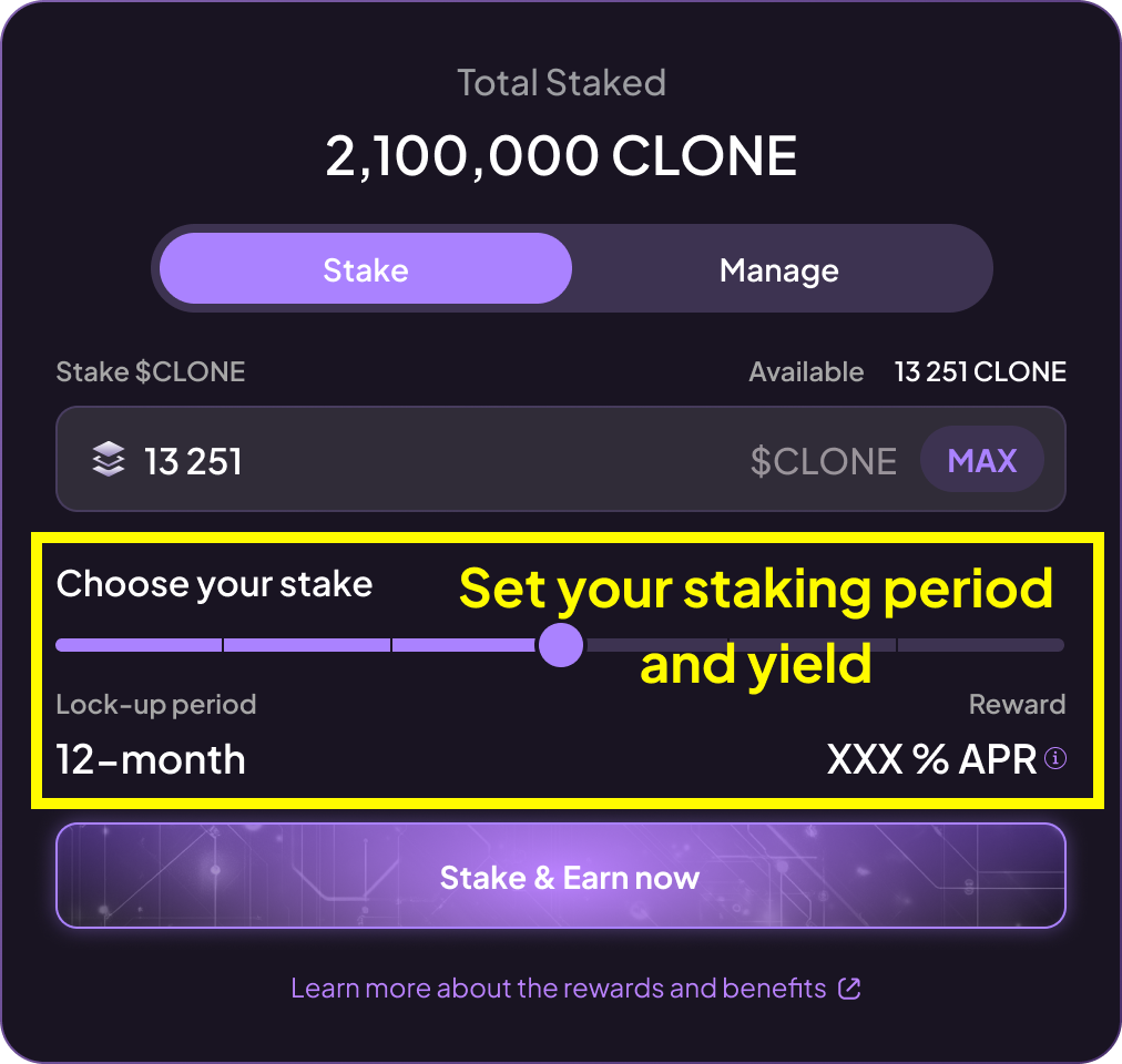 Use the slider to set your preferred staking type and duration. As you move the slider, you’ll see both the lock-up period and the $CLONE yield APR update in real time.