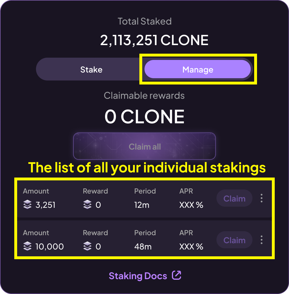 "Manage" lets you view and control your staking. Here, you can see all your individual stakings, their terms, and the claimable rewards.